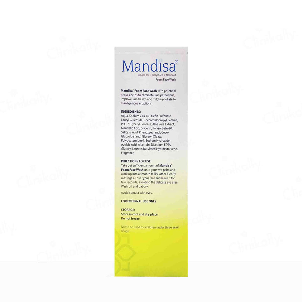 Mandisa Foam Face Wash is a dermatologist-formulated cleanser enriched with Mandelic Acid, Salicylic Acid, and Azelaic Acid to target oily and acne-prone skin. Its unique formula helps eliminate acne-causing pathogens, unclog pores, and mildly exfoliate dead skin cells, improving overall skin health. Infused with Aloe Vera Extract, Glycerin, and Allantoin, it soothes, hydrates, and prevents irritation while maintaining skin balance. Free from oil, parabens, formaldehyde, and SLES, Mandisa Face Wash is gentle yet effective for daily use, leaving skin refreshed, clear, and healthy-looking.
